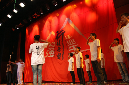 與會領導與嘉賓、自強畢業(yè)生、大學生志愿者在旗幟前莊嚴宣誓并進行火炬交接儀式(本網(wǎng)記者 余翔 攝影報道)